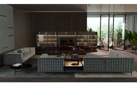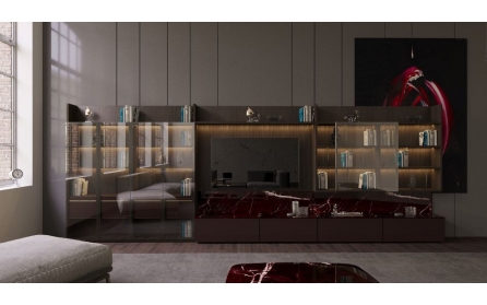 Büyük hacmi, sürgülü ve klasik cam kapakları ile sergilemeye değer aksesuarlarınızı hep göz önünde tutacak bu TV ünitesi; ahşap dokusunun zenginliği ve vişne rengi mermer detaylarının bir araya geldiği yüksek kalitede bir estetik sunuyor.