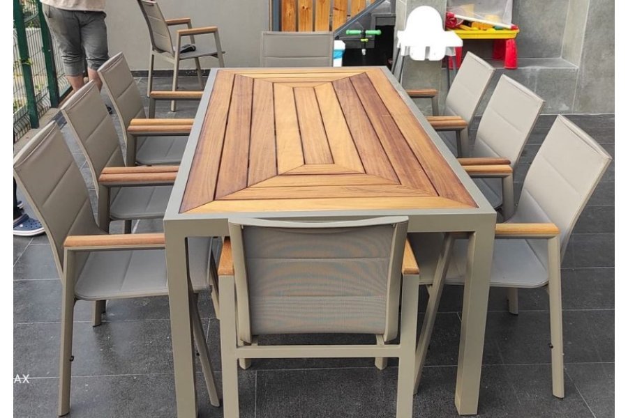 Masamız alüminyum iskelet üzerine iroko ağacı işlenerek üretilmiştir ve dış mekan kullanımına uygundur.