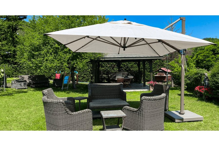 Flex Şemsiye, yandan direkli tasarımıyla 9m2 alanı güneş ve olası yağmurlardan koruyarak keyifli anlarınıza eşlik eder.
