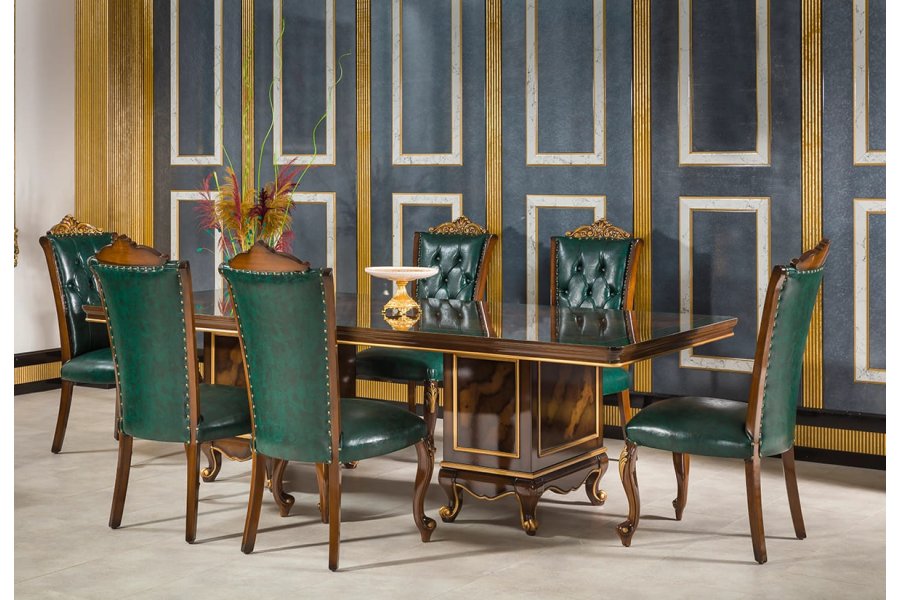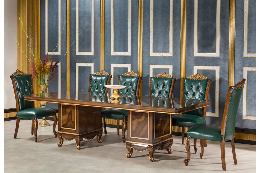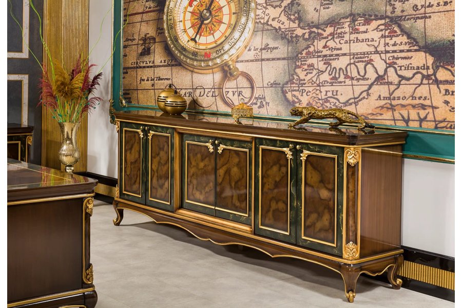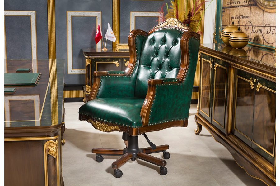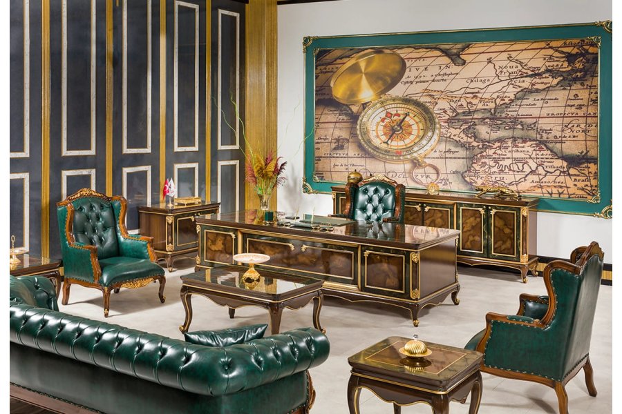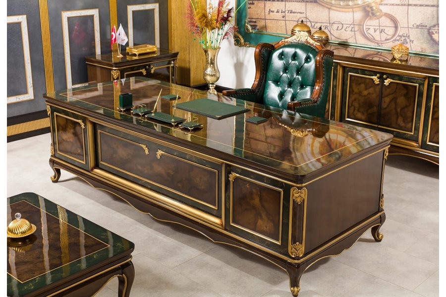 Bu özel tasarım ofis takımı, yalnızca bir çalışma alanı değil; geçmişin ihtişamını ve bugünün otoritesini bir araya getiren bir başyapıt. Klasik çizgiler, altın detaylar ve koyu ahşap dokusu, ofisinize eşsiz bir karakter kazandırır.