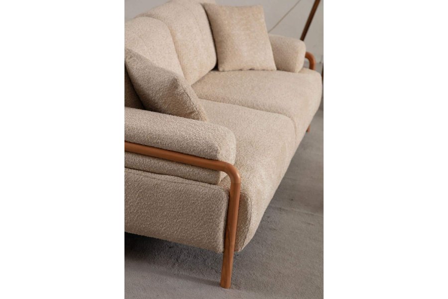 - Tasarım: Kanepenin kollarından yere kadar uzanan, yumuşak kavisli ve bütünleşik masif ahşap çerçeve yapısı
