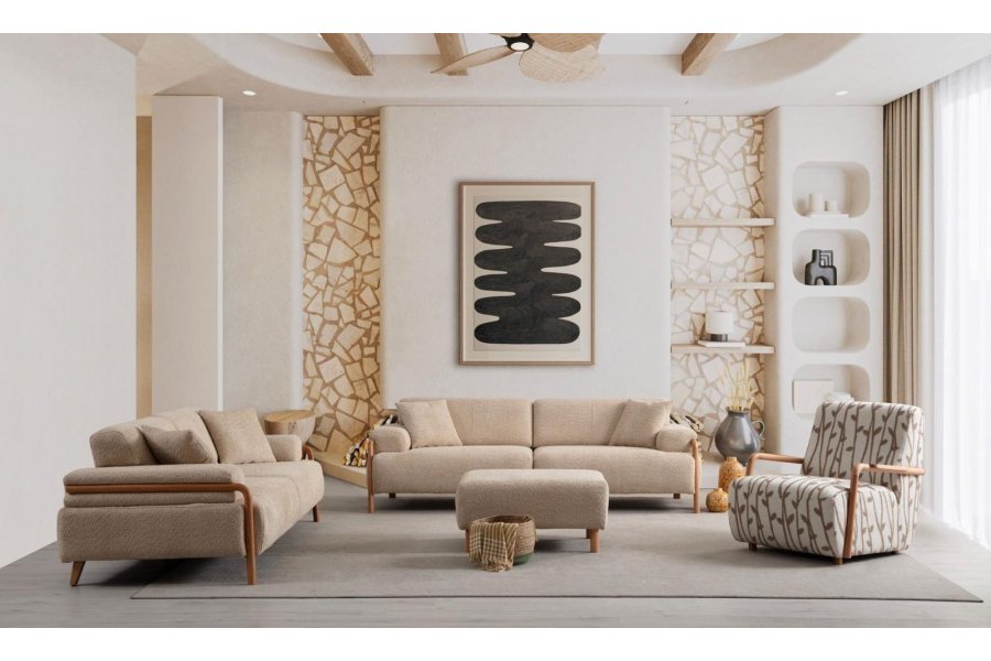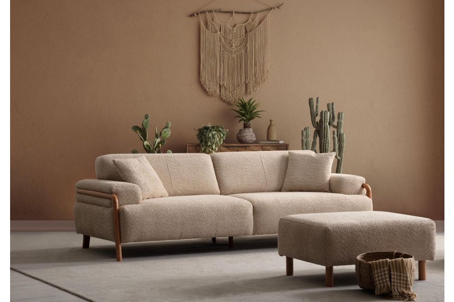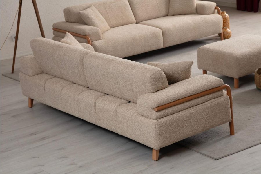 Fiona Koltuk Takımı, İskandinav minimalizmini doğal materyallerin sıcaklığıyla buluşturarak yaşam alanınızda dingin ve sofistike bir atmosfer yaratır. Yumuşak tuşeli buklet kumaşı ve tasarımı çevreleyen masif ahşap iskeletiyle, hem görsel bir hafiflik hem de üst düzey bir konfor sunar.
