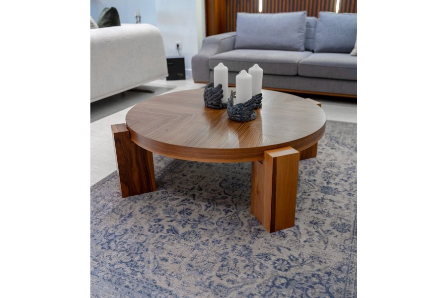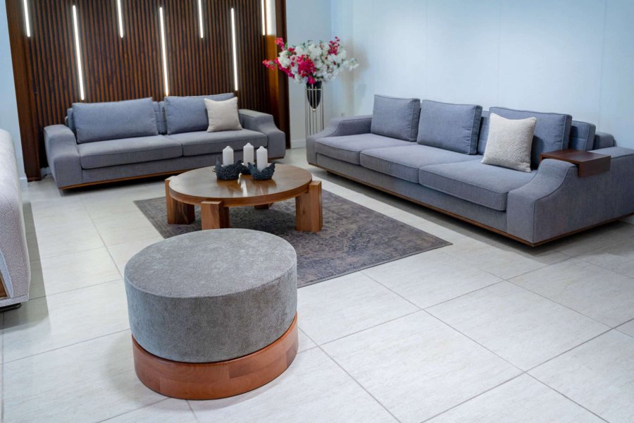 • Tamamlayıcı Parçalar: Takımın formunu destekleyen geniş oturumlu kanepeler ve ahşap tabanlı silindirik şık puf modülü