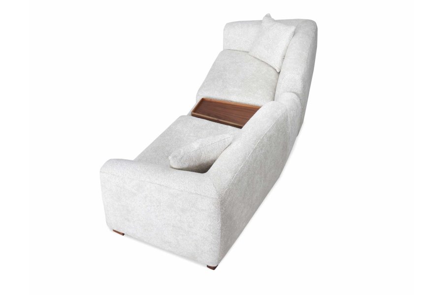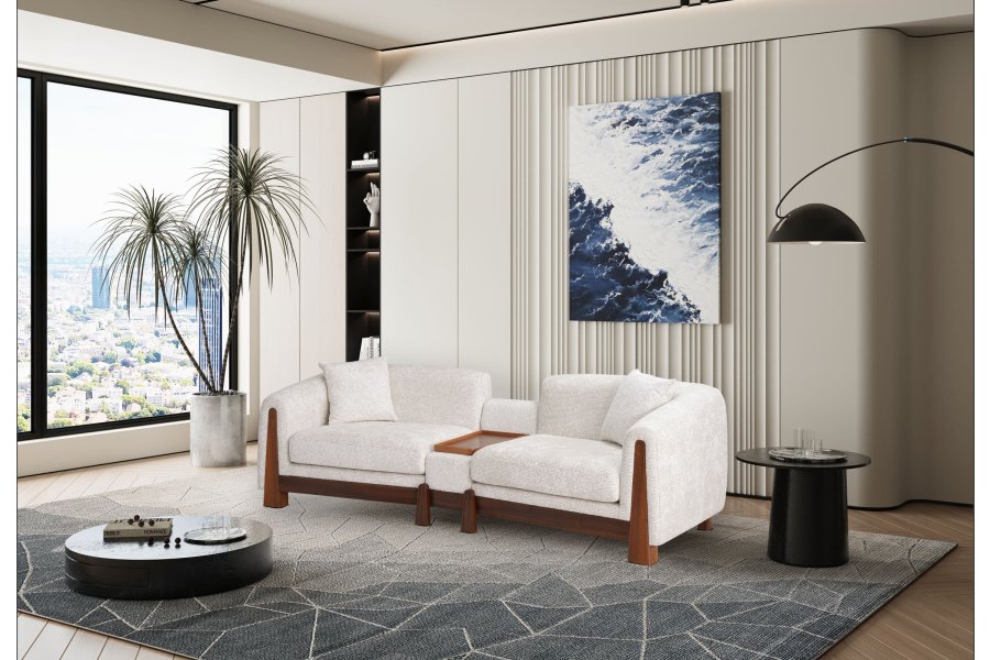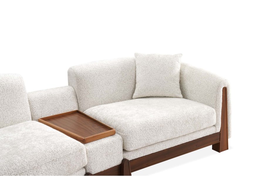 Sırt ve kol yapısındaki eğimli hatlar ile modüller arasına yerleştirilen ara ahşap paneller, takıma hem doğal bir sıcaklık hem de mimari bir derinlik katar.