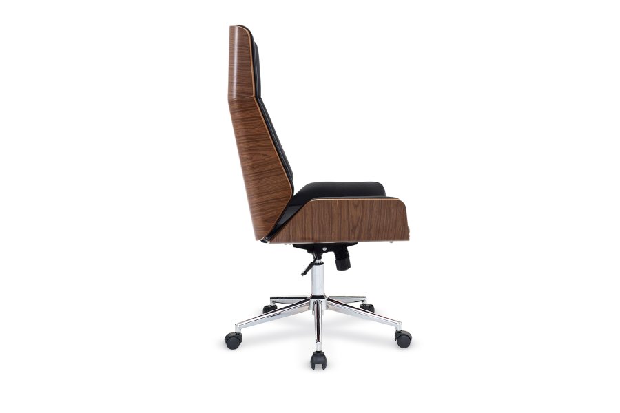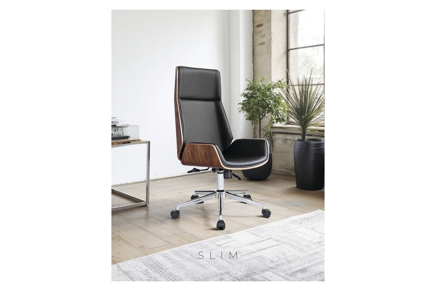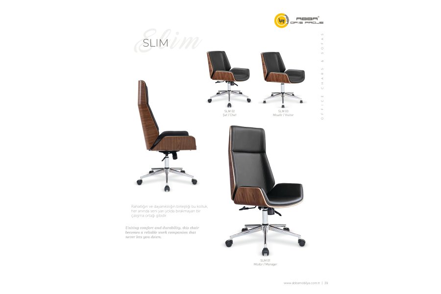 Slim Çalışma ve toplatı koltuğu, Doğal ceviz kaplama ahşap sırt detaylar, İpek mat cila. İç oturma fontu, polüretan kalıp P.P sünger  Krom ayak, Senkron Mekanizma, 55 mm ithal tekerlek donanımı ile,  Ofisinizde üst seviye estetik ve görsel kalite sunmaktadır.